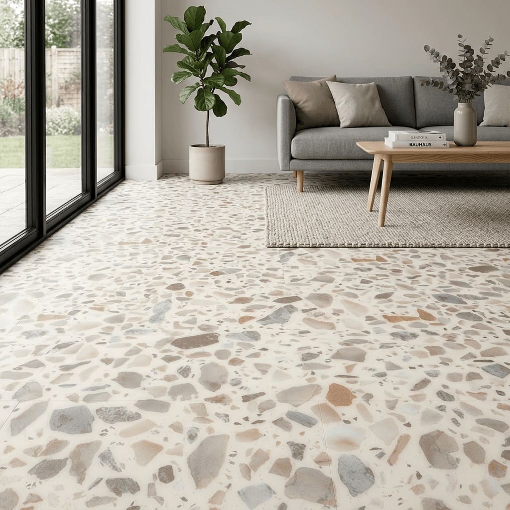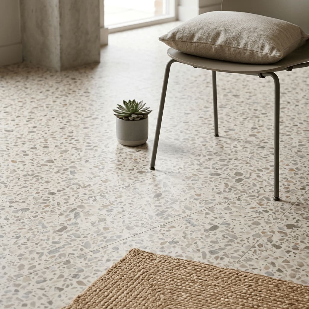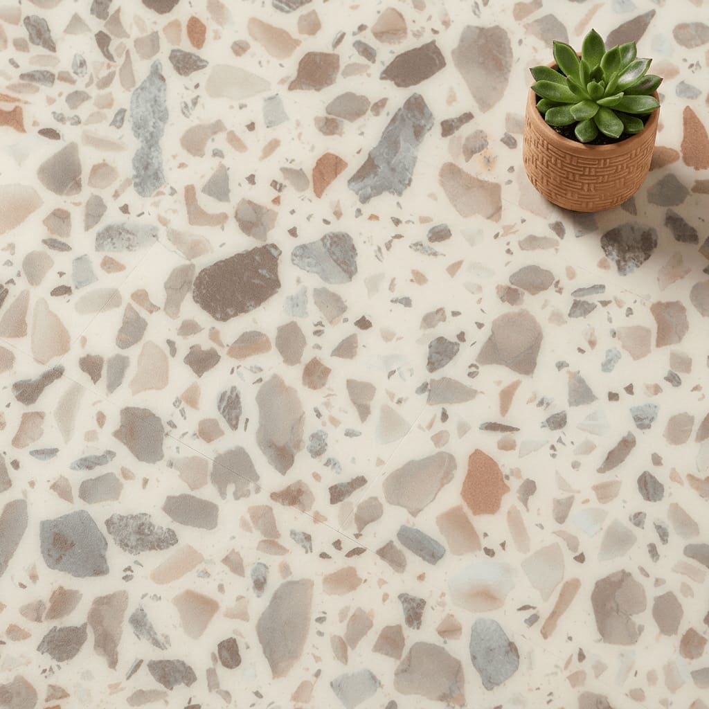- Small-scale terrazzo design featuring warm grey, clay, and terracotta tones for a sophisticated, contemporary stone effect
