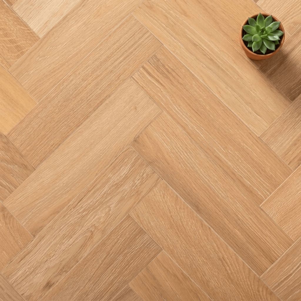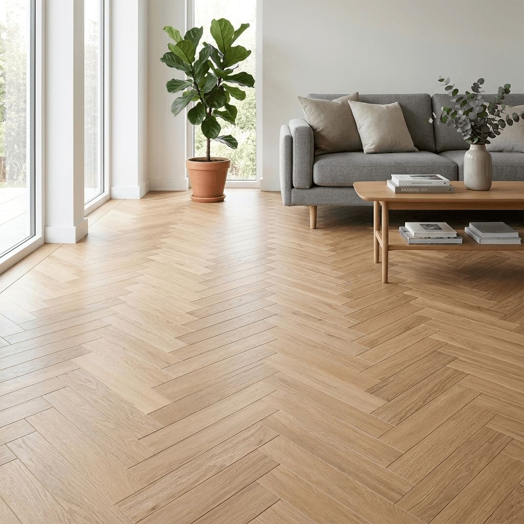 This Beeston Oak Herringbone engineered wood flooring brings a sophisticated and timeless aesthetic to your home. Crafted with a 3mm solid oak wear layer and a total thickness of 10mm, it offers the perfect balance of durability and elegance. The brushed surface highlights the natural wood grain, while the lacquered finish provides a subtle sheen and robust protection.