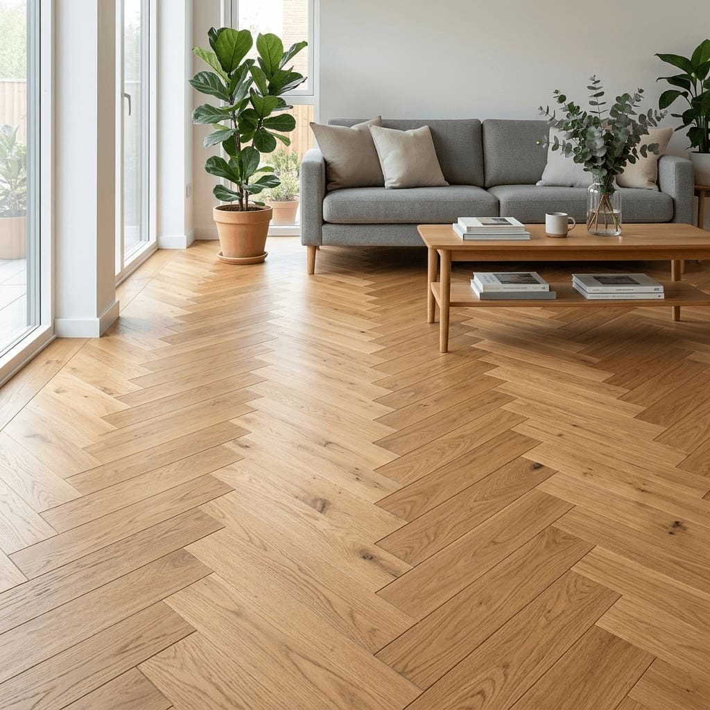 GF Engineered Wood Herringbone Farndon Oak is a premium flooring solution that combines the timeless appeal of parquet with modern engineering. Crafted from high-quality European oak, this 15mm thick flooring features a substantial 4mm wear layer, ensuring it can withstand the demands of a busy household while maintaining its stunning appearance for years to come.