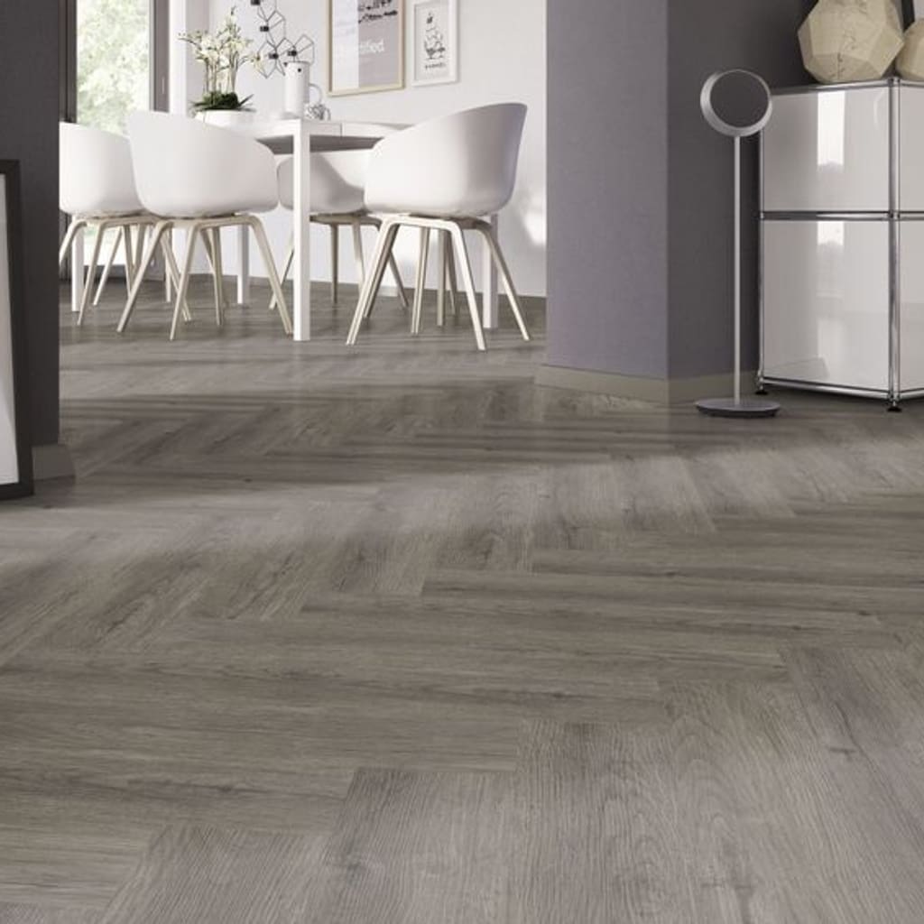 - Authentic wood-effect luxury vinyl tiles (LVT) featuring a sophisticated herringbone pattern.