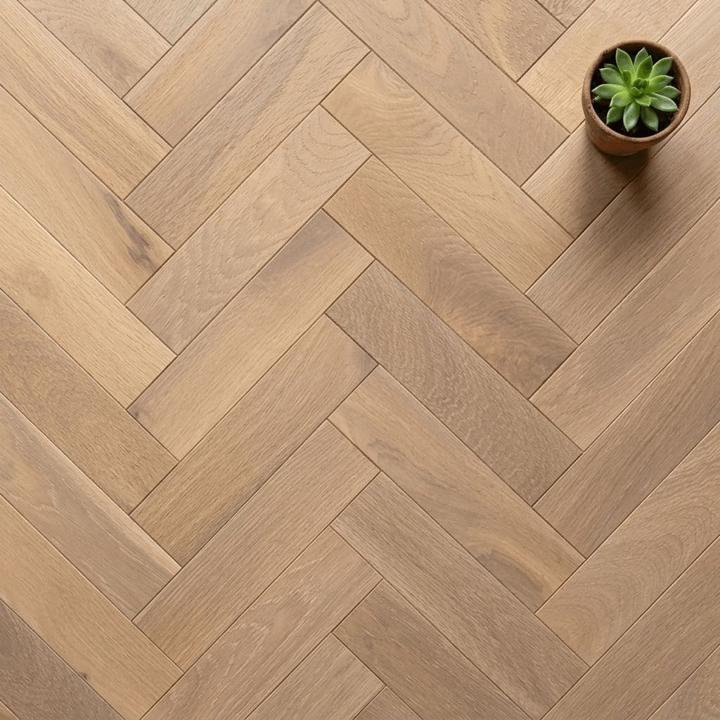 - Elegant herringbone parquet style that adds a contemporary geometric aesthetic to any room.